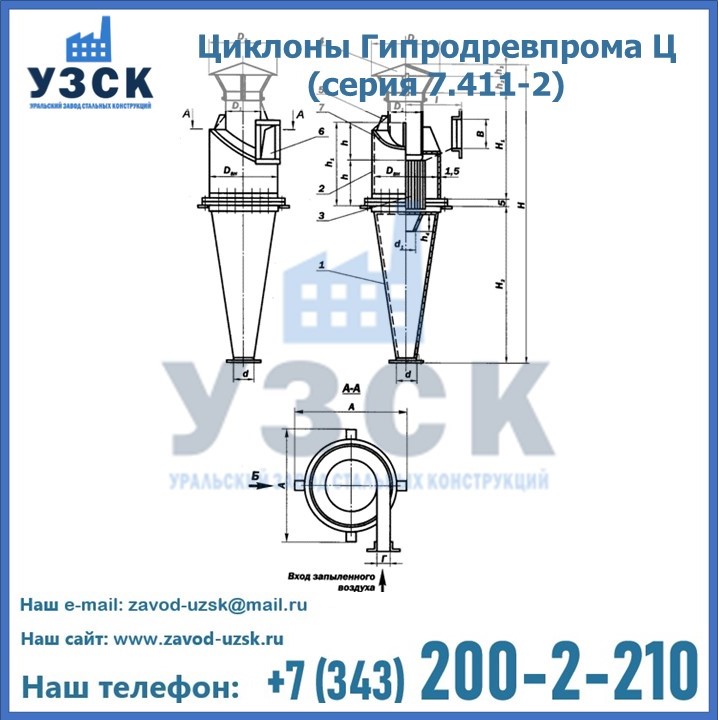 Циклоны Гипродревпрома Ц (серия 7.411-2) высокого качества можно купить в компании «УЗСК» в Димитровграде. Наши специалисты предоставят всю необходимую информацию информацию и помогут с выбором модели циклона. Подробные технические характеристики, конструкцию, параметры, ассортимент и стоимость продукции можно также найти на сайте УЗСК.