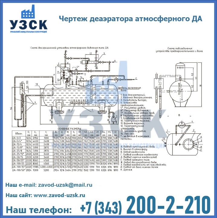 Приобрести качественное оборудование, в том числе, деаэраторы ДА, можно в компании УЗСК в Димитровграде. Мы предлагаем долговечную и надежную продукцию по приемлемой цене. Заказать и купить деаэраторы или другие изделия высокого качества можно через сайт Уральского Завода Стальных Конструкций, или позвонив по указанному в разделе «Контакты» телефону.